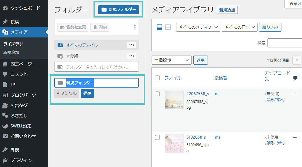ただただメディアライブラリ内に保存していくだけですと、後で画像を探すときに探しづらくなってしまいます。