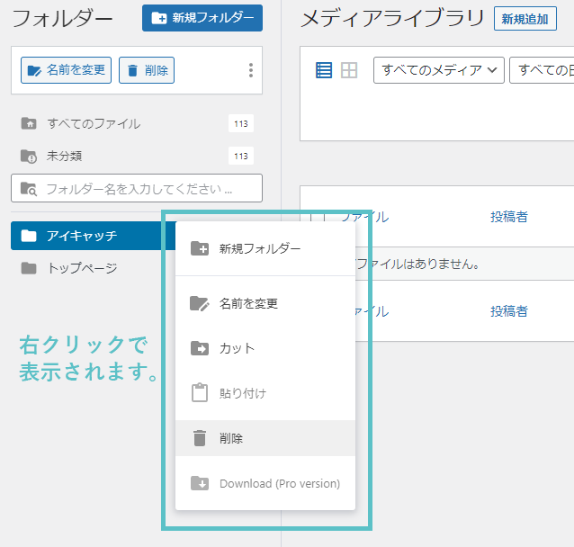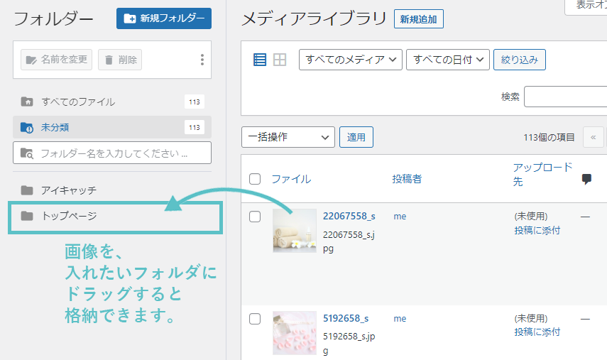 右側の「メディアライブラリ」から画像をフォルダにドラッグするだけで任意のフォルダに格納できます。