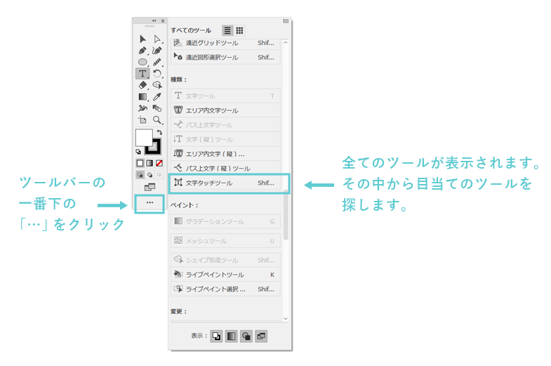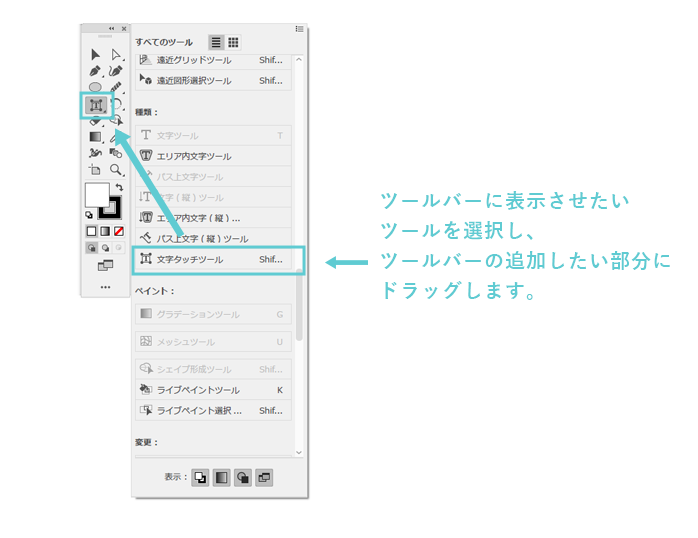 ここでは例として「文字タッチツール」を探してツールバーします。