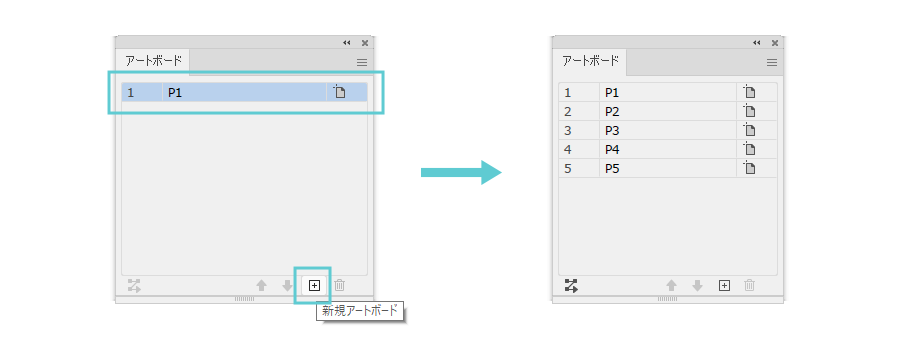 アートボードパネルで必要なページ数分を複製します。「アートボードパネル」で1のところをクリック後、複製ボタンにドラッグします。