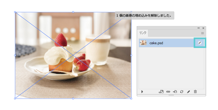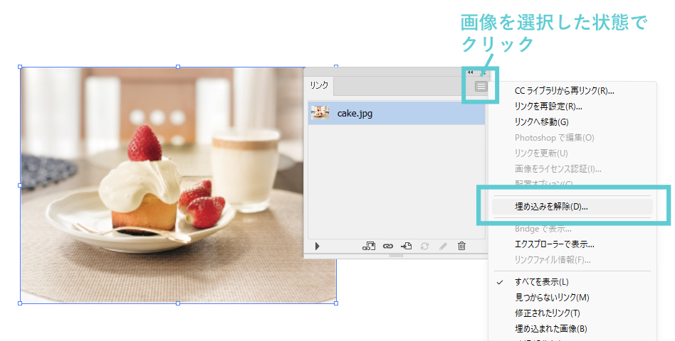 埋め込み解除したい複数の画像を選択ツールで選択した状態で、先ほどと同じく「リンク」パレットの右上メニュー、または上部から「埋め込み解除」を選択します。