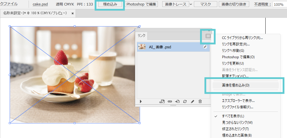 取り出したPSDデータは、illustratorのデータ上で「リンク画像」になっていますので、再度埋め込みが必要な場合は「埋め込み」してください。