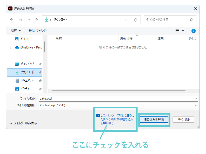 「このフォルダーに対して選択したすべての画像の埋め込みを解除」にチェックを入れて「埋め込みを解除」をクリック。