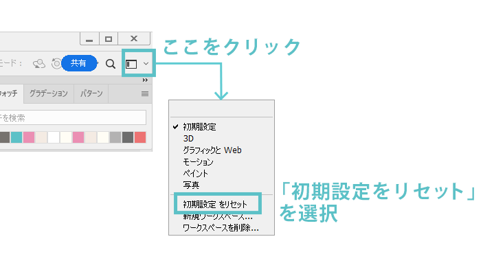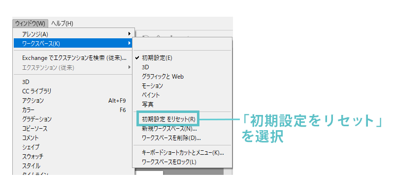 作業中、パネルを色々と移動してしまい、ツールバーが消えたり、パネルの位置が分からなくなったりすることがあります。その際は「ワークスペースをリセット」するのが便利です。