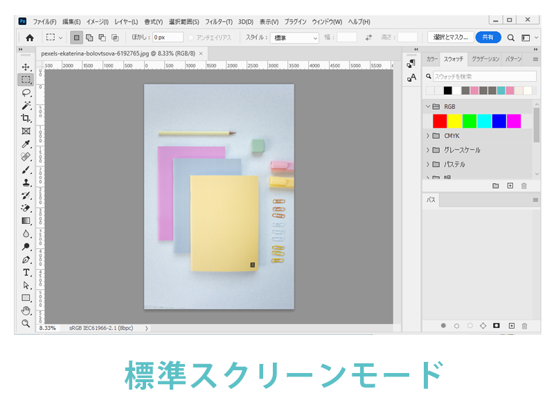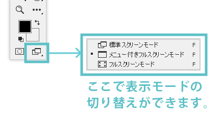 基本、①の「標準メニュースクリーンモード」で作業をすると思うのですが、Photoshopのパネルやメニューのすべてを非表示にして、モニター全体にキャンバスだけを表示して全体を確認したいときは③の「フルスクリーンモード」が便利です。
